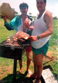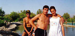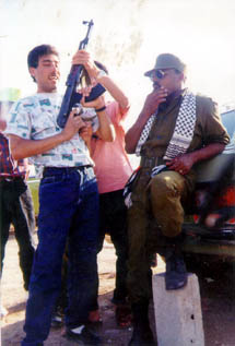 PERSONAL STORIES ![]() Right: Moa'taz (right) and a friend at a barbeque. He was one of the best looking young men in Rafat, Ramallah. Moa'taz was respected, well-behaved and well brought-up. He always wanted his mother to wear the best and the most expensive clothes. He used to call her al-Azziza, ("the dearest"). He left school because of harassment by soldiers. One day aged 19, during the Intifada, he was on his way to school when three Israeli soldiers and an officer kidnapped him and took him to an abandoned field with lots of trees. They beat him fiercely in the abdomen and on his face until he bled and some of his teeth fell out. They then tried to hang him from one of the trees. When he started to scream for help, a woman with her daughter who were passing by heard him. He was shouting "Mother! Mother! Help me!". The passing woman answered back "Yes, son, I'm coming" and tried to get him away from the soldiers. She asked her daughter to bring him some water. The soldiers then left. He washed the blood and sand from his face, before continuing on his way, to school. Moa'taz was arrested several times and was also injured on numerous occasions. One of these injuries was caused by live ammunition hitting him in the mouth. After being arrested several times, he developed an ulcer. He was brave and his peers looked to him as a hero and started to call each other Abu al-Moa'taz ("Father of Moa'taz"). Moa'taz's nickname was "ghazouz", which was used by the whole neighborhood. ![]() Above: Moa'taz (center) and two friends by the Sea of Galilee, in calmer days. Moa'taz liked to dress well, and used to spend hours looking at himself in the mirror before he could decide what to wear. He used to eat chicken liver, but never sheep liver! He also liked pasta, preparing it on his own, and loved kufta (spiced meat) with tomato sauce, his favourite dish. <>One day he went to a wedding party where they offered to the guests food in a European style/tradition. This got Moa'taz thinking, and he announced to the other guests that on his wedding day, people will get "the best food that has ever been offered at a wedding party!" His family, in the days after his death, offered those who were paying their respects more than sixty large trays of kufta and sixty large trays of pastry.Moa'taz had already built and furnished a house in preparation for his wedding. He dreamed of having a daughter who would be able to do housework as perfectly as his mother. The thing that his family and his friends remember about him most was his laughing face. He always used to make people laugh. He loved children very much. Whenever he saw a child, he would kiss him or her and clean their hands and face where they were dirty from playing. Moa'taz was honest and direct. If he had to say or give his opinion of someone, he would tell the truth, even if it was to the person's face. If he felt that the person was not a good person, he would say to him "God forgive you. You are a bad person!" He offered to pay for all the expenses for his mother to make Haj (the pilgrimmage to Mecca). She did make it and returned with a traditional black Bedouin robe, headdress (hatta' or kuffiyeh) with an a'gal to hold the headdress in place. He wore them and went to the house of his grandfather and uncle to visit. They did not recognize him in his new clothes! He had three sisters and five brothers and was the fourth in the family. He never used to forget any of the family occasions and special days. He loved to surprise the family and used to joke around all the time, laughing with them all. Moa'taz used to love to listen to Abdel Haleem Hafez, the "Elvis Presley of the Arab World", and Fairuz. He used to sleep to the sound of their music on the stereo. It would play until the morning, unless his mother would turn it off before she went to bed. He liked watching Indian films, and he loved basketball and football, the latter of which he and his friends would play in the streets every day. The football used to fly into his grandmother's garden and she would come out shouting at them to stop playing by the garden. He would tell her, "It's OK, Grandma, we only do it three hundred times a year!" Once he phoned one of his teachers at home and talked to him as if he was a famous Egyptian actor. On another occasion, he called the same teacher and talked to him as if he was an Iraqi. The next time he phoned him, he pretended to be a high level officer in the PA and told him that he was coming to his house to drink tea, a great honour in Palestinian society. He was good at impressions. ![]() Above: Moa'taz working in a supermarket. Moa'taz use to dream that he would one day be able to open a chain of supermarkets. If he couldn't do it at home, he wanted to move to the United States to fulfil his dream. During the last months before his death, a few of his friends came back from the United States and he began to think more and more seriously about leaving. His mother hid all of his travel documents so that he would not be able to leave. Moments before he left home on the day of his death, Thursday 26 September 1996, his mother asked him to give her a lift to her daughter's house. She thought that this way he would not have the opportunity to participate in the clashes. Moa'taz asked her "When do you want to be there?" "At ten o'clock," she answered. "So, we've got lots of time then", he said. He finished his tea and told his mother, "Your tea was delicious today and your breakfast was great! More delicious than any other day." After this he went to the backyard and picked a pomegranate from the tree and ate it. His little brother told him how beautiful his hair was, his mustache, his cheeks, his clothes....and asked him "How is it that you are so handsome?" "God made me like this....what can I do, brother?" responded Moa'taz grinning. His sister said that Moa'taz liked soft-soled shoes, but no one ever knew the reason for this. On the day of his death, 